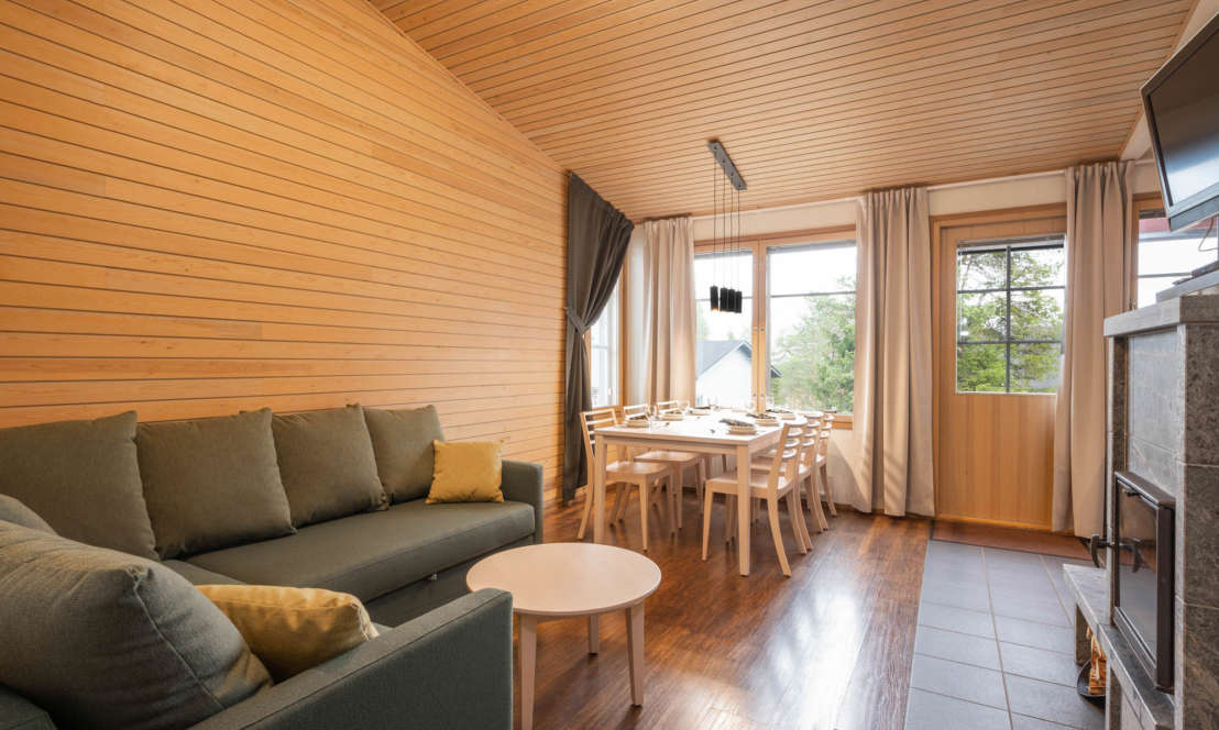 MastonAitio cottages are designed to meet the needs of active groups. The functional apartments have two bedrooms. In the living room area, the sofa bed can be used as an extra bed for 1‒2 persons without extra charge. A well-equipped kitchen, separate WC, and a private sauna provide a smooth stay.