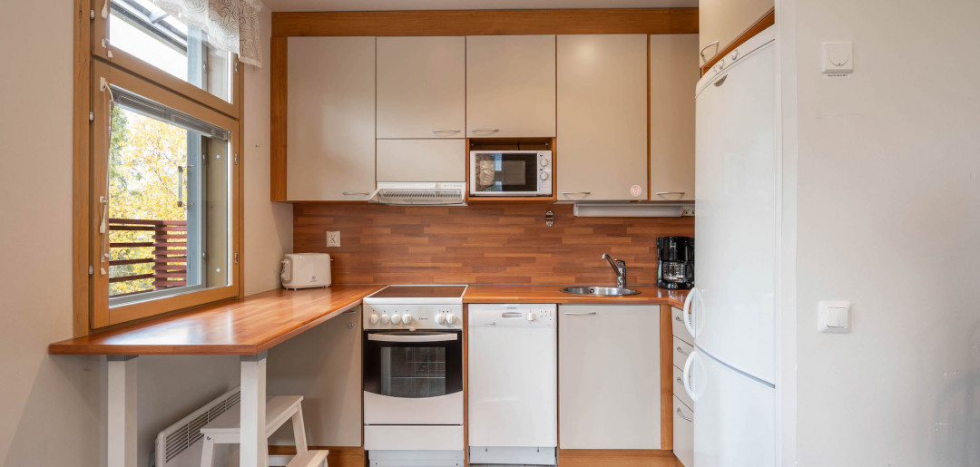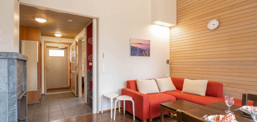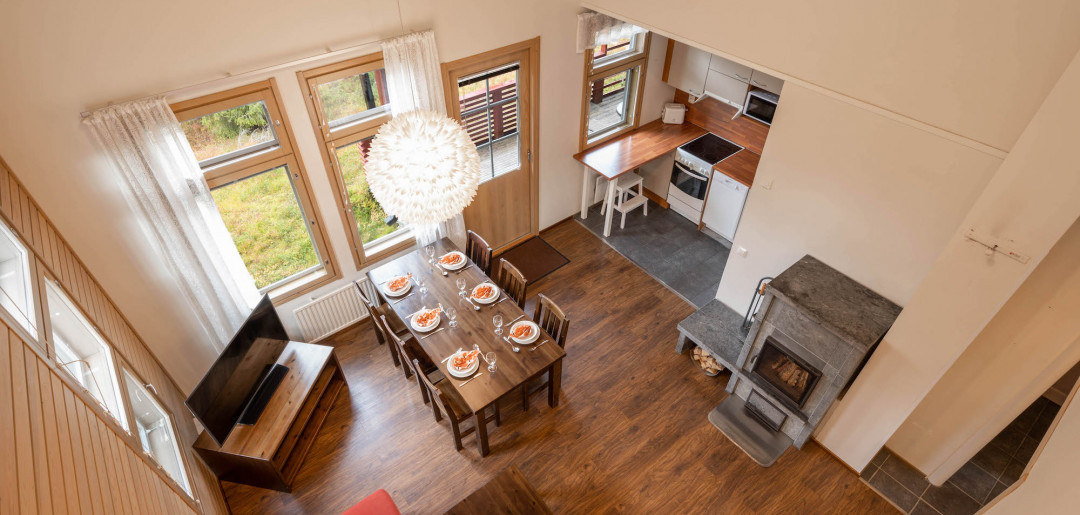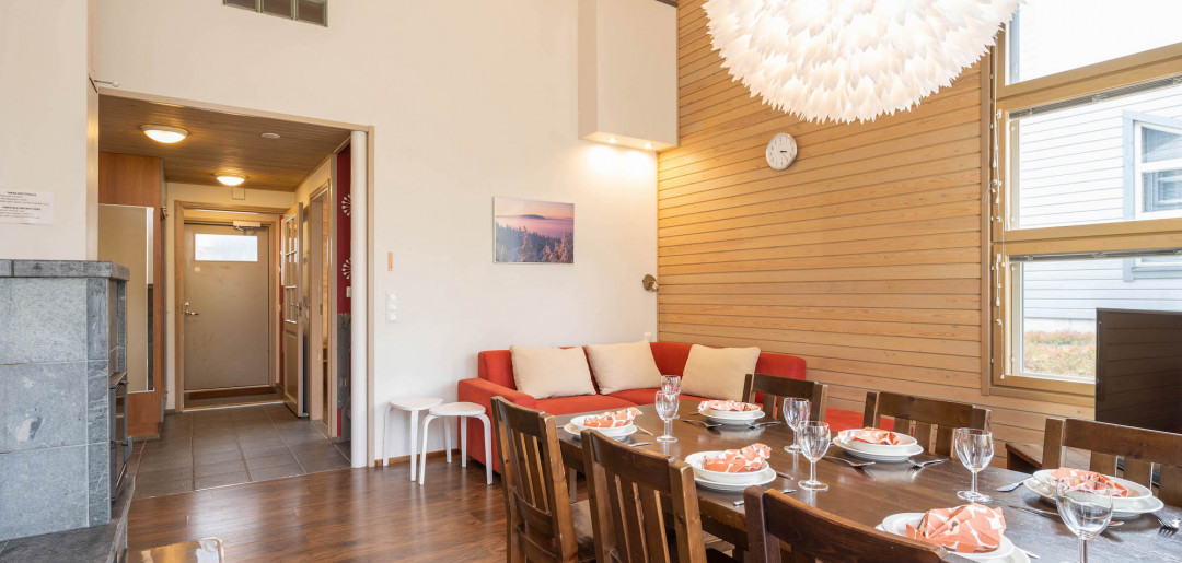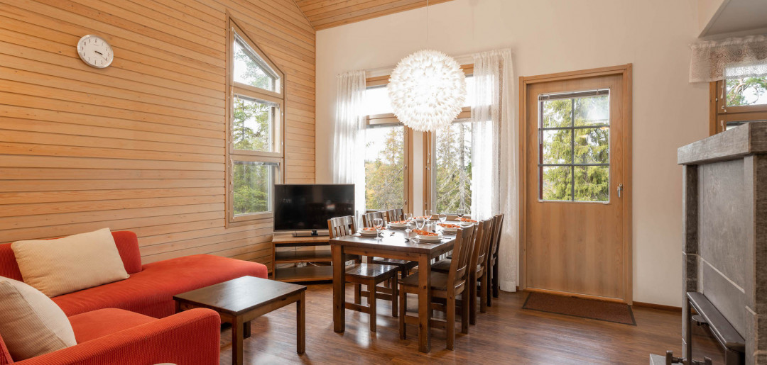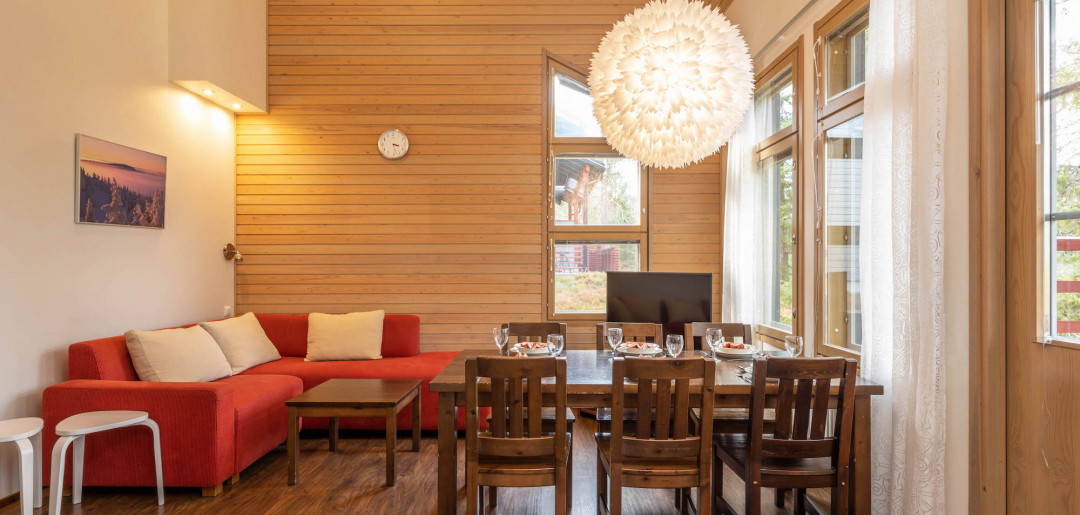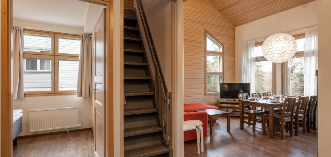 MastonAitio cottages are designed to meet the needs of an active group. The functional apartment has three bedrooms‒two at the apartment downstairs and one upstairs. In the living room area, the sofa bed can be used as an extra bed for 1‒2 persons without extra charge. A well-equipped kitchen, separate WC, and a private sauna provide a smooth stay.