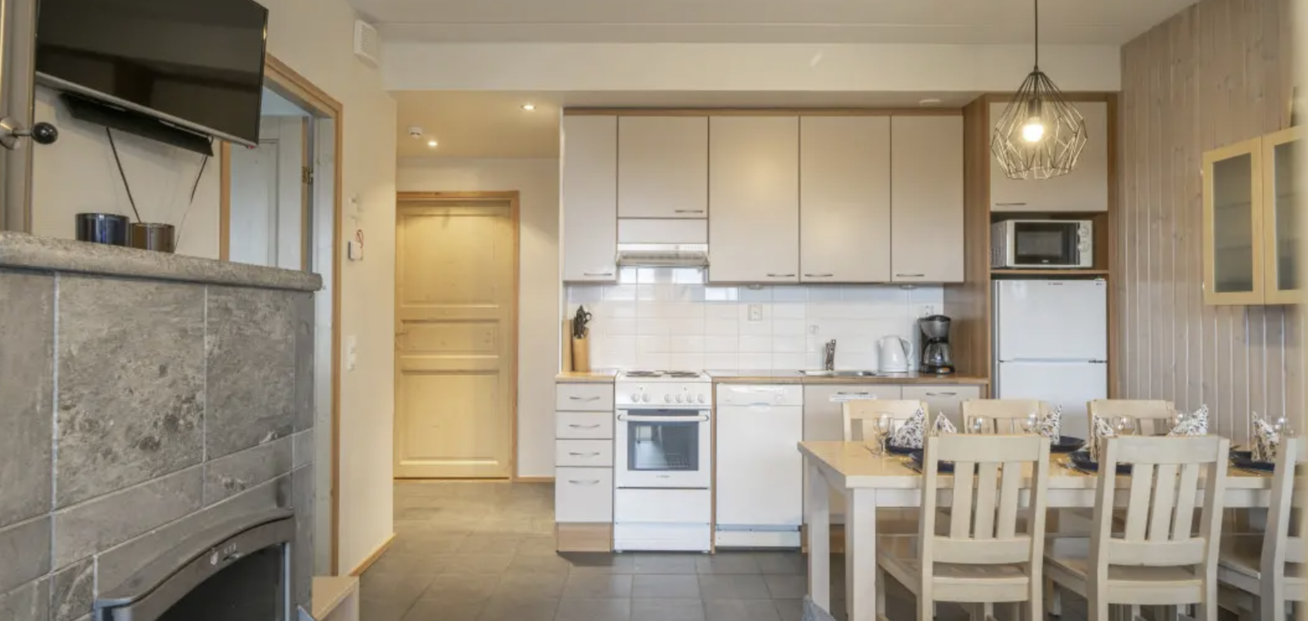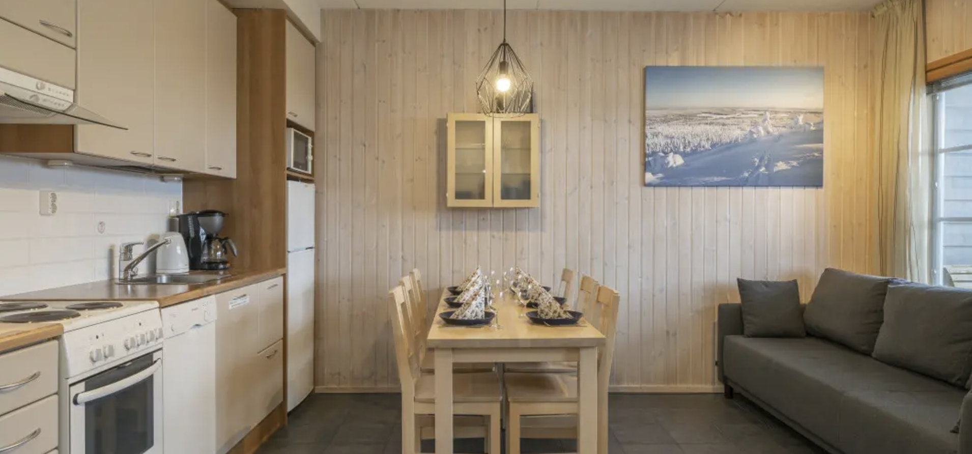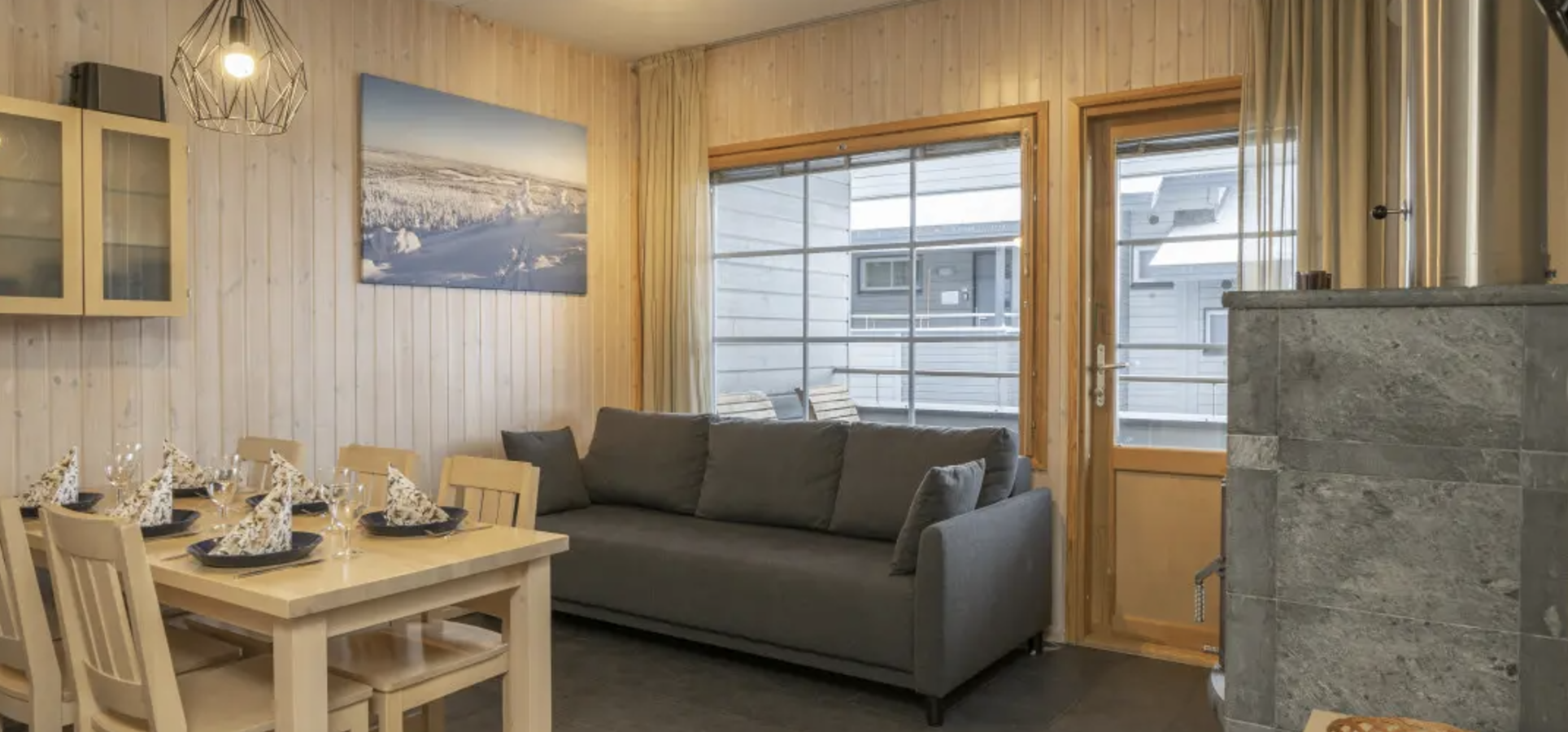 Cottage-like two-bedroom apartment by the lake offering a spot for winter ice swimming and a summertime beach. Peace and quiet by the nature, and your favourite ski trail right next to you. RukaTonttu51 apartments are suitable, for example, for two couples. The apartment has two bedrooms. In the living room area, the sofa bed can be used as an extra bed for 1‒2 persons without extra charge. The apartment kitchenette and living room area has a fireplace. When relaxing in the apartment private sauna, you can take a dip in Talvijärvi lake.