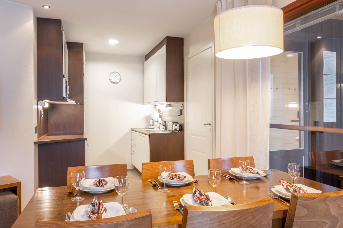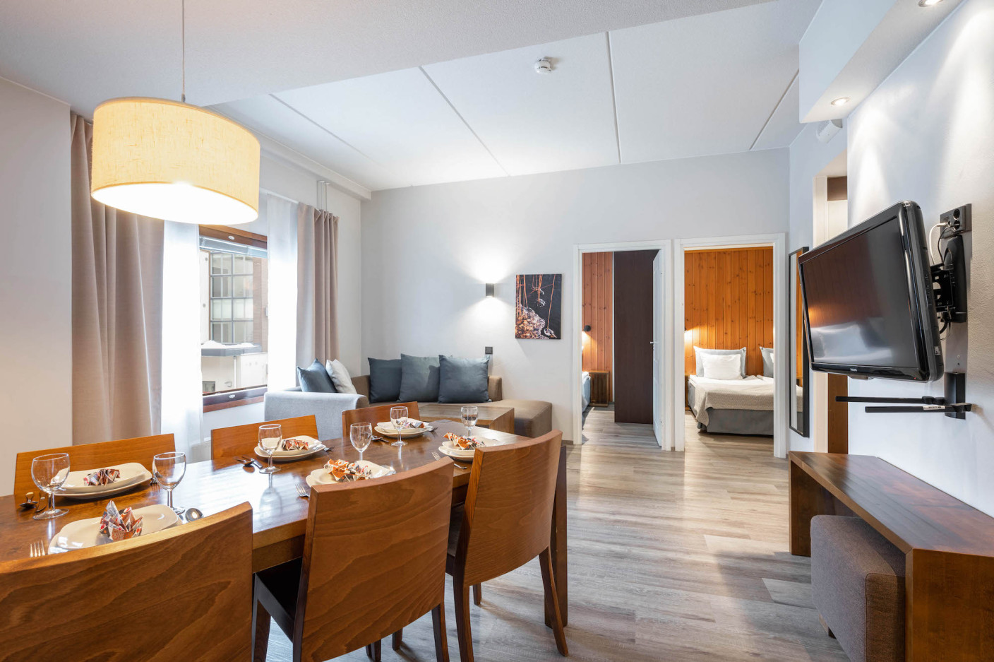 Renovated in 2021, the RukaVillage70 apartments have two separate bedrooms. In the kitchen and living room area, the sofa bed can be used as an extra bed for 1‒2 persons without extra charge. The apartment has two separate WCs as well as a washing machine. The access to the balcony with the jacuzzi is from the sauna department.