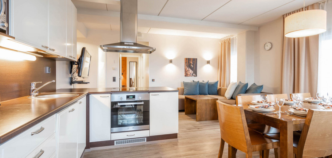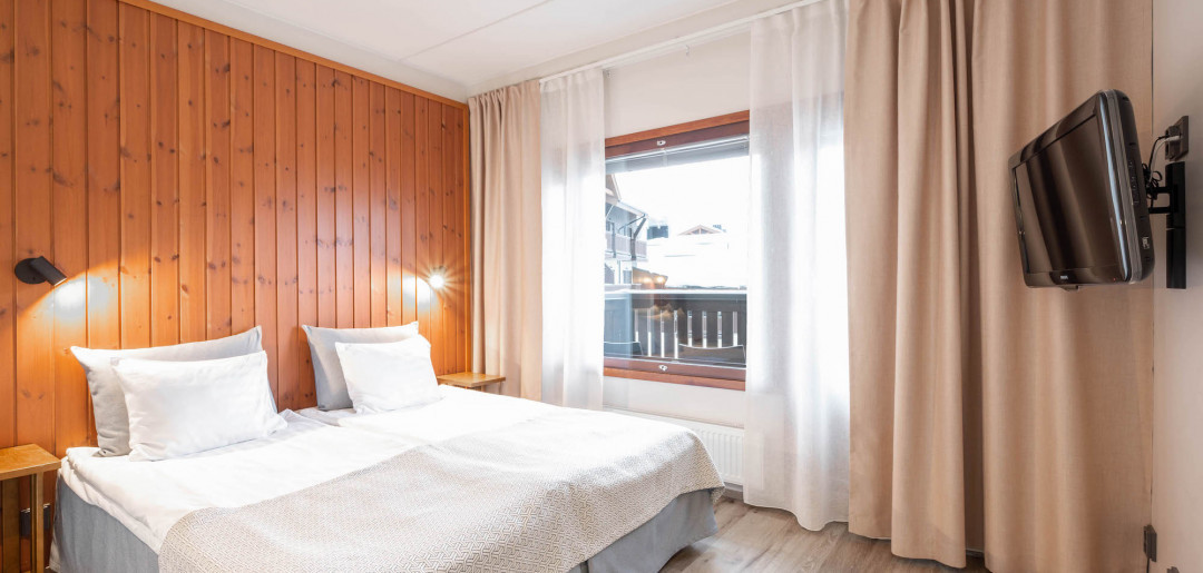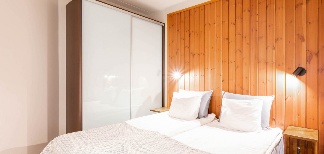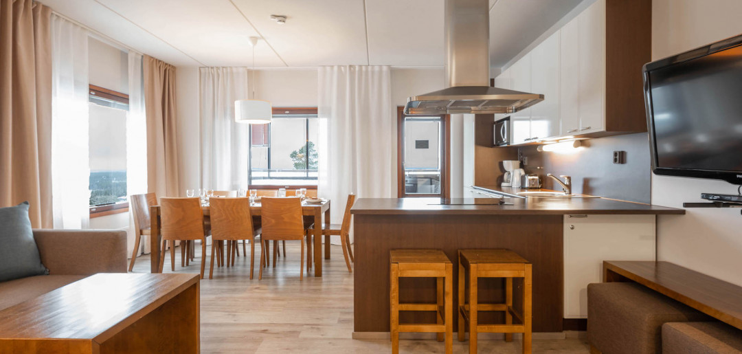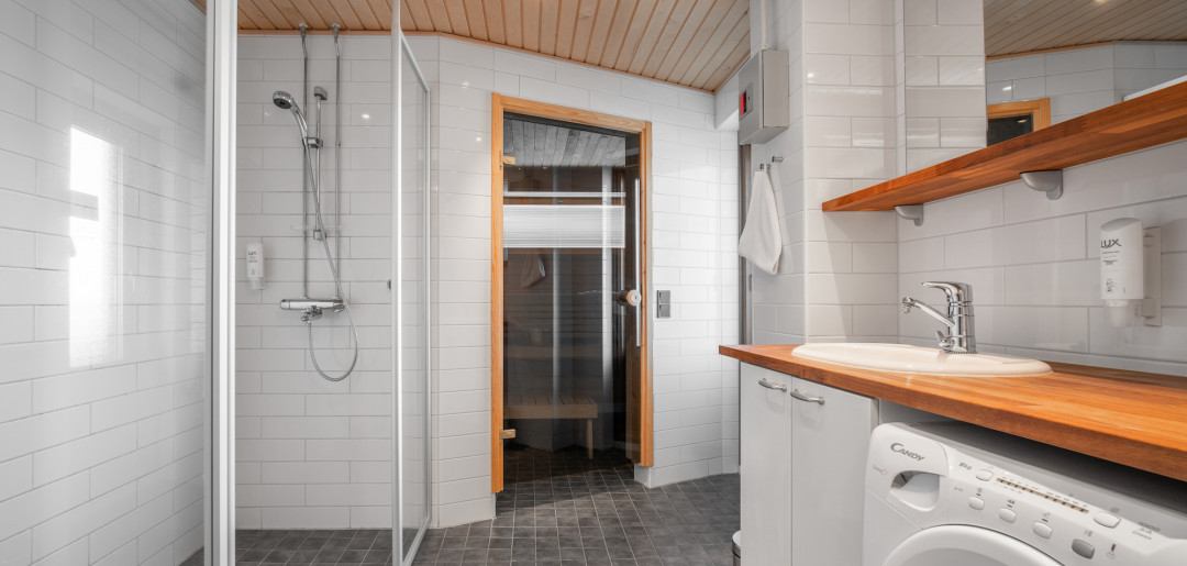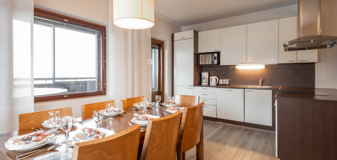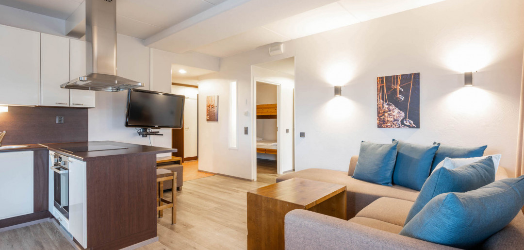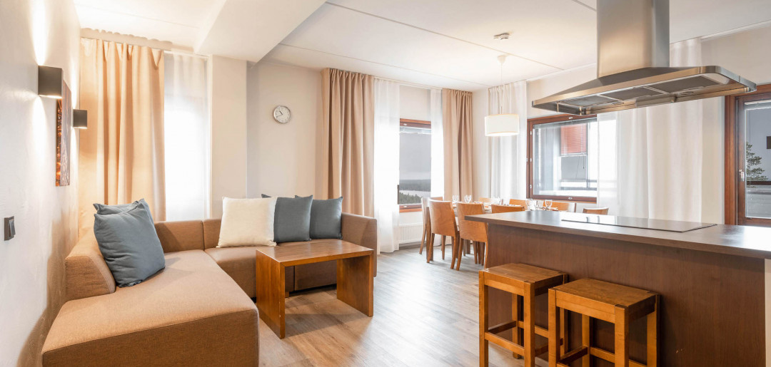 Renovated in 2021, the RukaVillage88 apartments have two separate bedrooms. In the kitchen and living room area, the sofa bed can be used as an extra bed for 1‒2 persons without extra charge. The apartment has two separate WCs as well as a washing machine. The access to the balcony with the jacuzzi is from the sauna department.